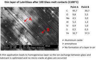 For container glass, this technology resulted in the development of a special lubricant (LGL2) for blank moulds, which is supported by a registered patent. Compared to traditional lubricants, LGL2 is distinctive in its composition, with aluminium ions added via a special process. In chemical connection with carbon, this results in a long lasting active layer of graphite to the blank surface.